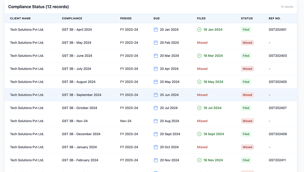- TDS Payments, GSTR-1, GSTR-3B, PT, PF—you can monitor every form by status and client.