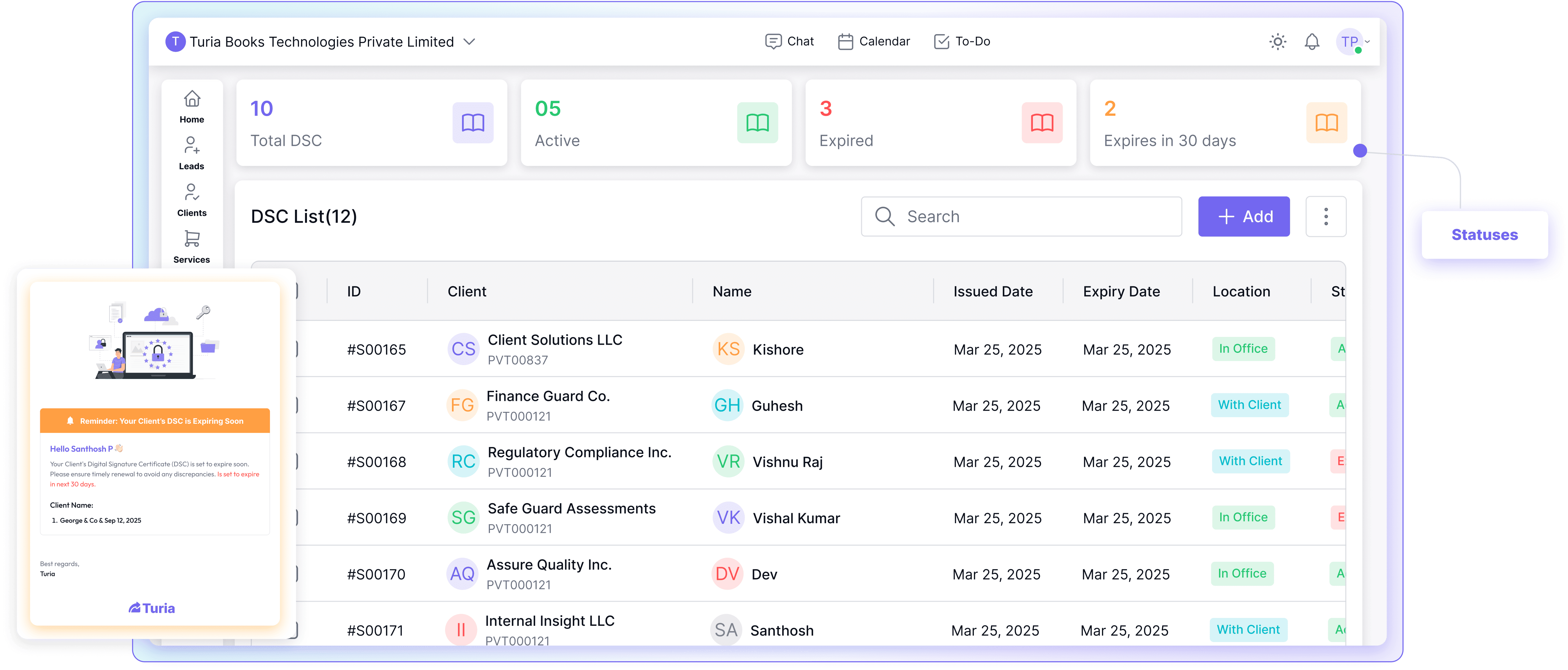 Turia’s DSC Register helps you track every client’s Digital Signature Certificate, get automated expiry alerts, and ensure 100% compliance—no more missed renewals or last-minute emergencies.